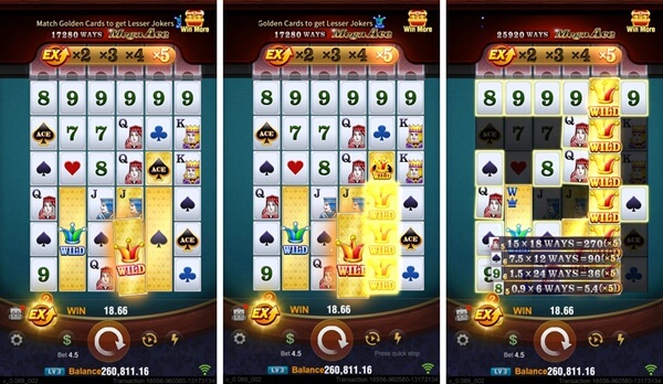 The highlight of Supper ACE is the golden cards. When they explode, they transform into Wild symbols, substituting any card to increase your chances of chain reactions and higher multipliers.